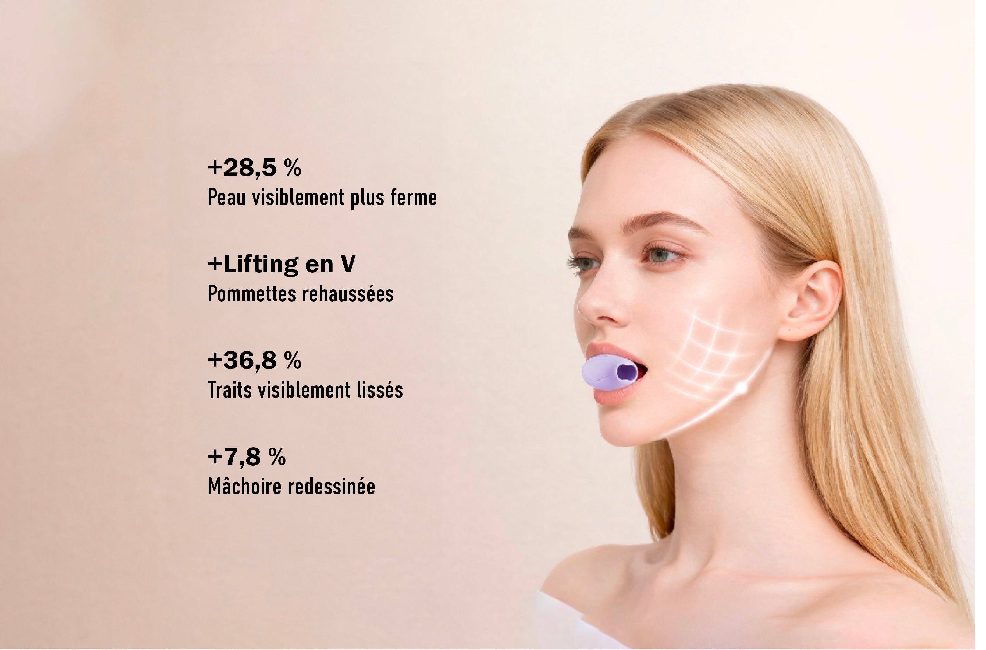Quelques minutes par jour suffisent pour activer les muscles essentiels du bas du visage. Résultat : une sensation de tonicité renforcée, un contour plus net et une apparence visiblement plus structurée.